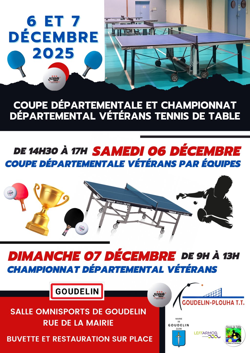 Coupe et Championnat Départementale vétérans de tennis de table les 6 et 7 décembre à la salle omnisports de Goudelin
