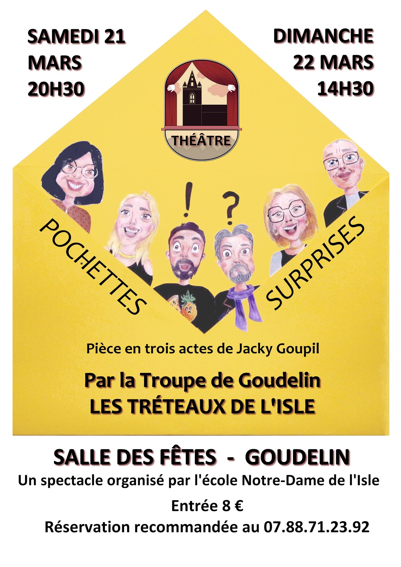"POCHETTES SURPRISES" pièce de théâtre en 3 actes de Jacky GOUPIL par les Tréteaux de l'Isle. A la salle des fêtes de Goudelin le samedi 21 mars à 20h30 et le dimanche 22 mars à 14h30.